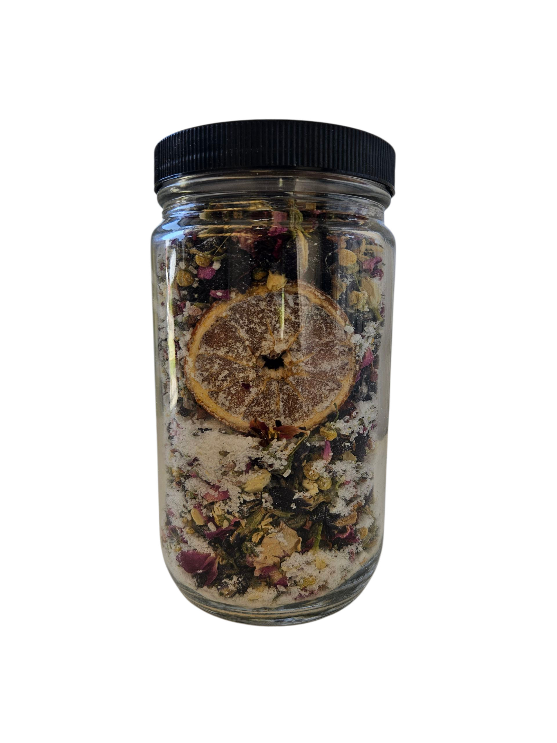 Epsom salt, pink Himalayan salt, roses, lavender, lemons, oranges, goat milk, Sodium bicarbonate, hibiscus, butterfly pea flowers, chamomile, jasmine flowers